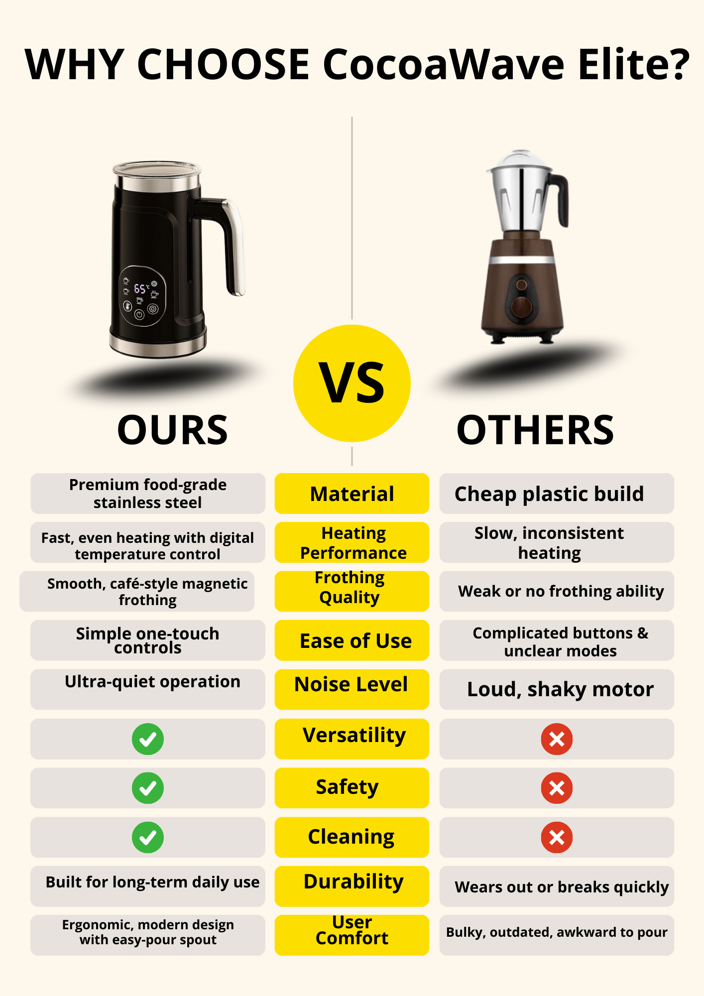 I expected the usual clumping issue you get with hot chocolate in low-quality devices, where the powder sticks to the bottom no matter what you do. But the magnetic whisk mixes everything smoothly, and the drink comes out perfectly blended without grainy bits.