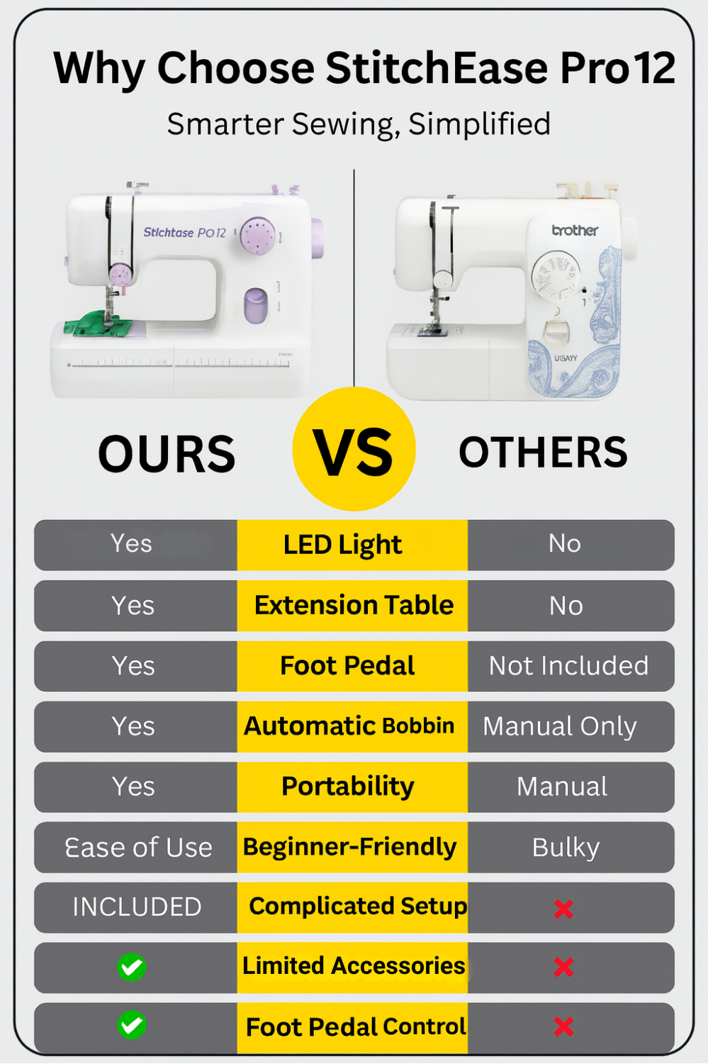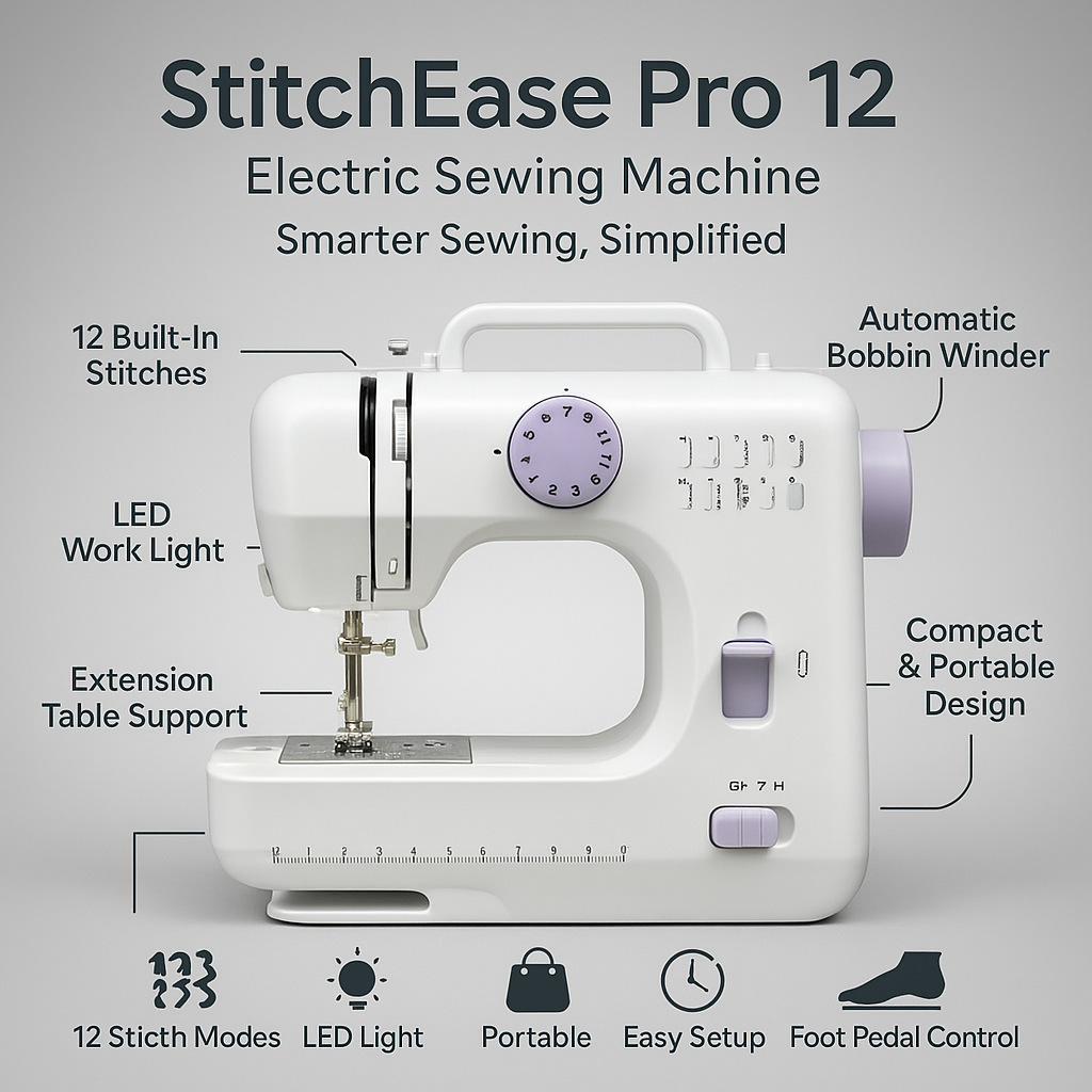 The StitchEase Pro 12 is designed with beginners in mind. With clear stitch selection and easy threading, you can start sewing confidently right out of the box.