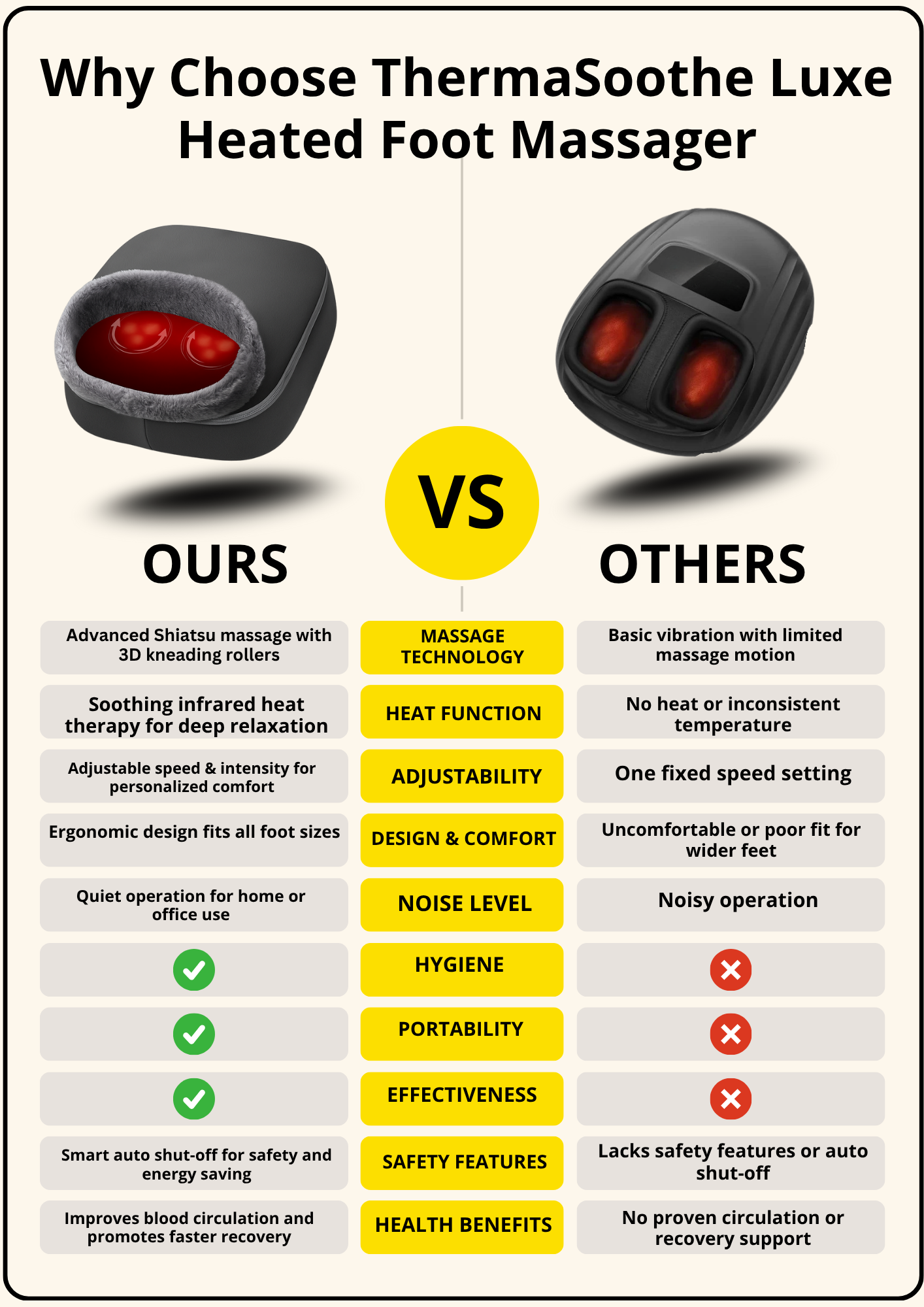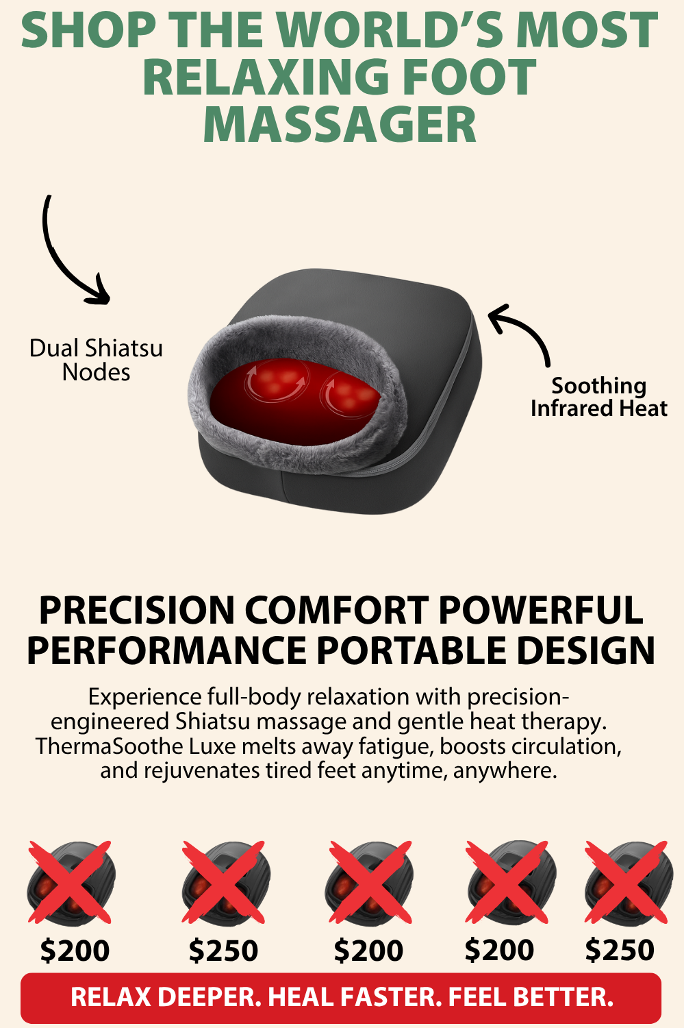 Crafted with innovation and care, the ThermaSoothe Luxe blends smart heat technology with ergonomic Shiatsu nodes to give your feet and back the ultimate relief. Itβs the perfect balance of luxury, therapy, and everyday comfort.