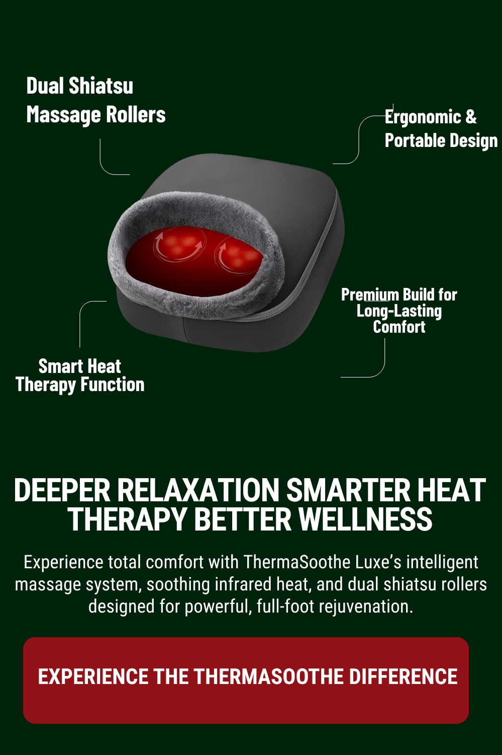 Experience next-level relaxation with ThermaSoothe Luxeβs advanced Shiatsu massage and heat therapy. Its precision rollers and soothing warmth target tension deep within your muscles, leaving you refreshed and pain-free after every use.